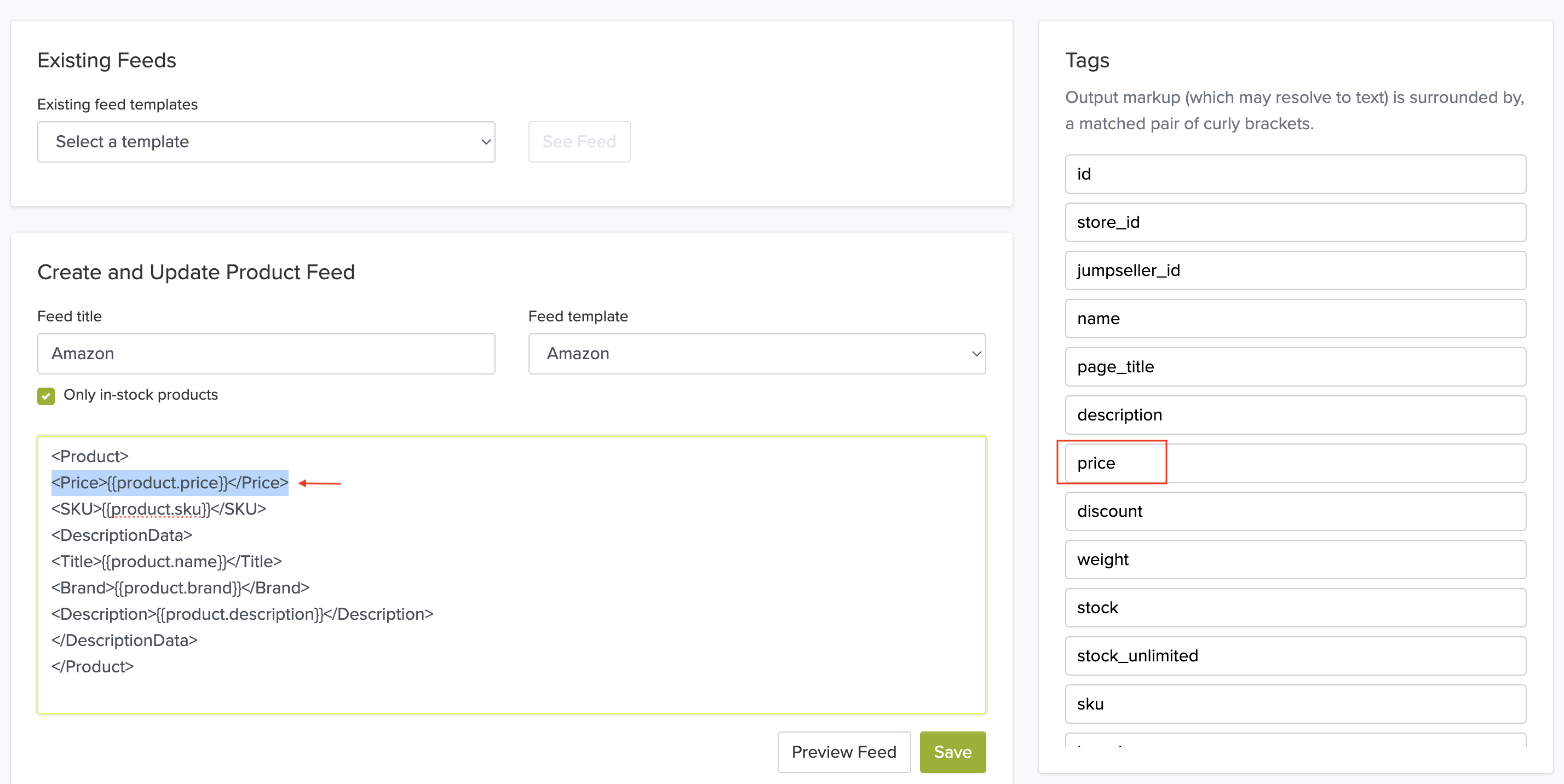 Os atributos do produto são adicionados utilizando “Etiquetas”. As etiquetas são os dados dos produtos da sua loja. Assim que gerar um feed, estas etiquetas serão substituídas pelos valores reais.