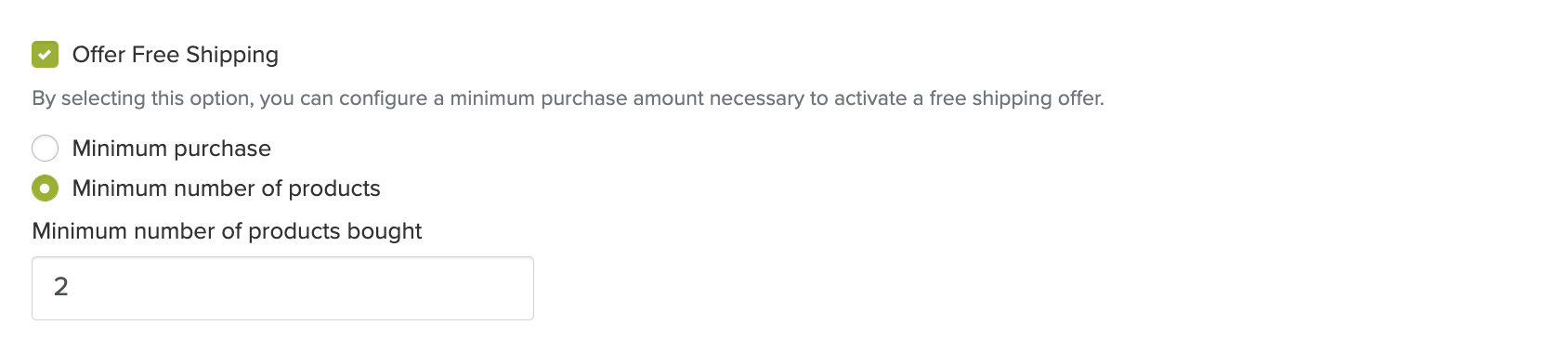Também pode incluir a opção Oferecer Portes Grátis com base no Valor mínimo de compra ou no Número mínimo de produtos.