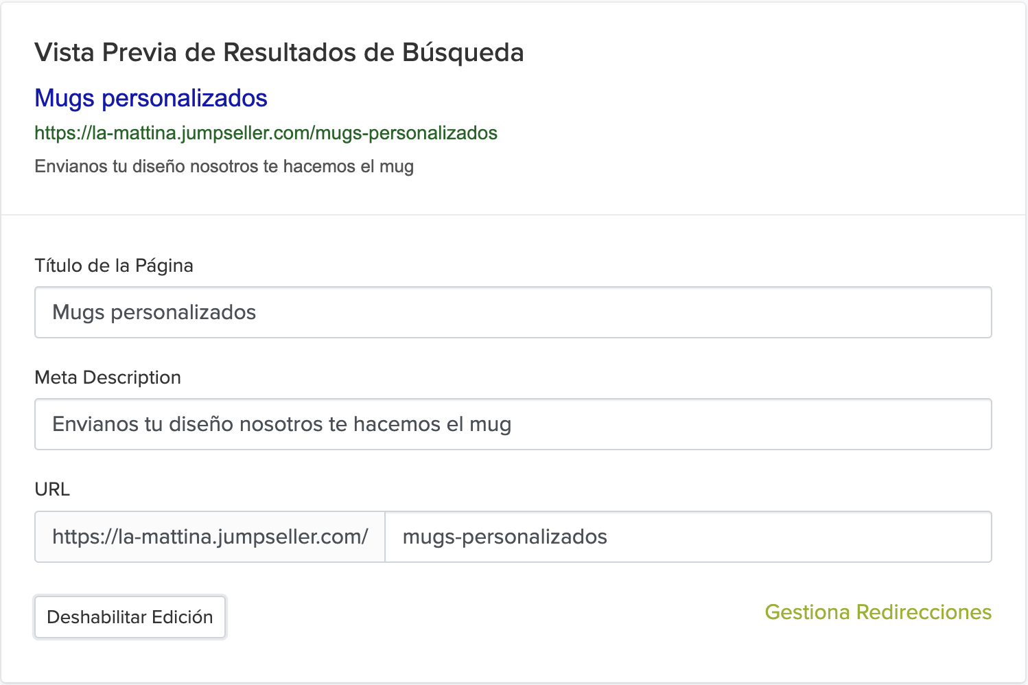 A sua loja já está otimizada para SEO, contudo, pode adicionar os dados relativos à maneira como o Google indexa as suas páginas. Adicione o título da página, a meta-descrição, e edite o URL.